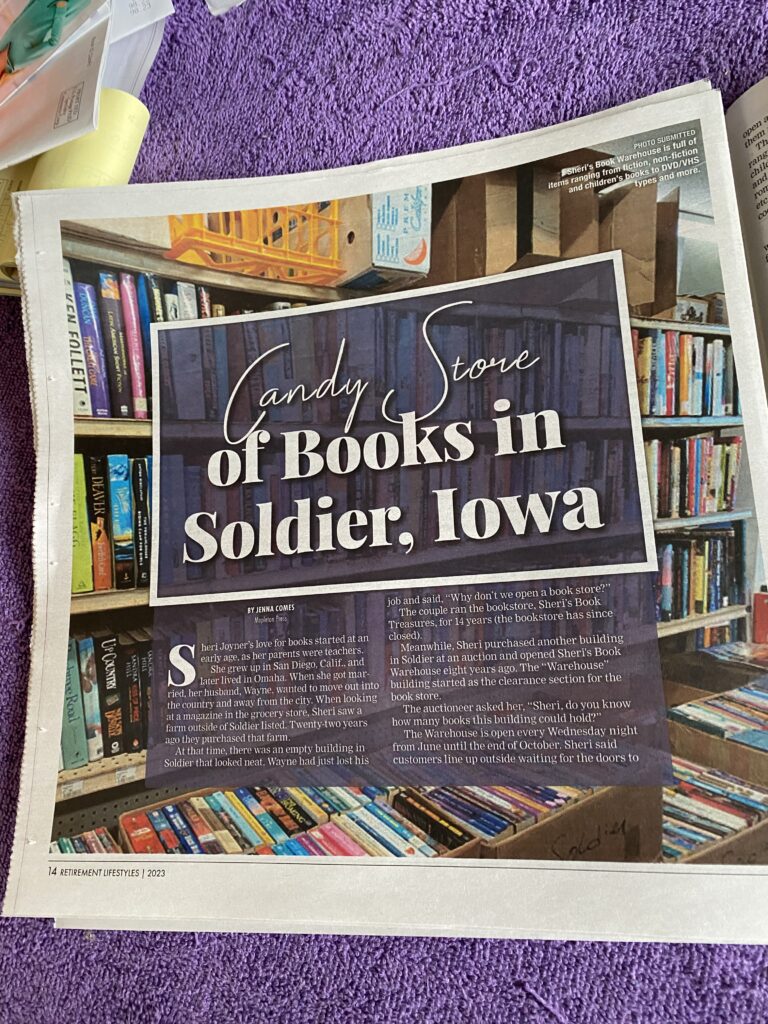 Sheri’s Book Treasures Soldier Iowa store location closed, but the Book Warehouse is open seasonally (May-Oct).